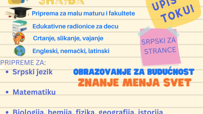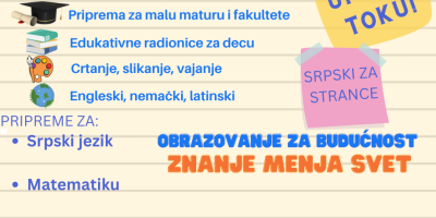 - Pripreme za malu maturu i fakultet: Srpski jezik, matematika, biologija, hemija, fizika, geografija i istorija.
